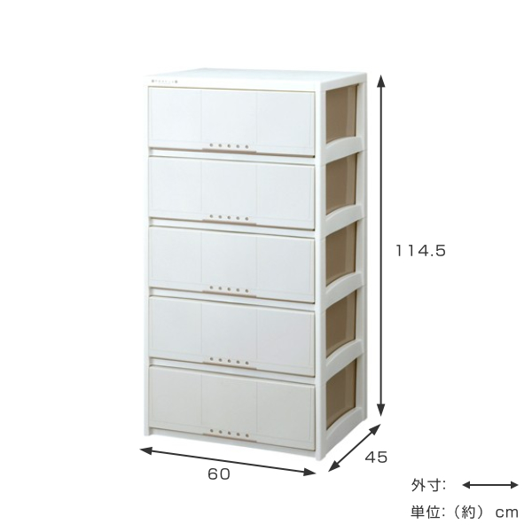 | サイズ | 約 幅60×奥行45×高さ114.5(cm) 引出内寸:約 幅53×奥行41×高さ19cm(×5段) |