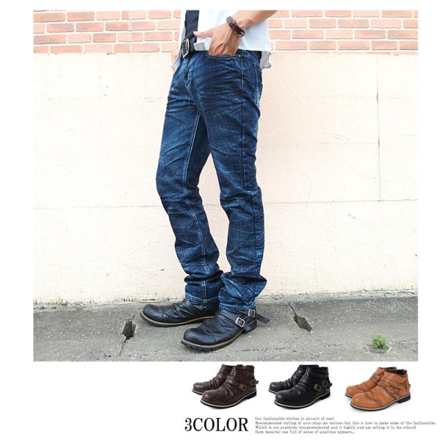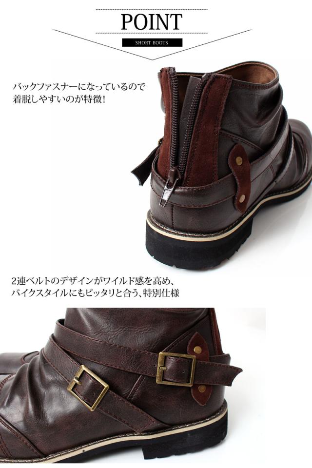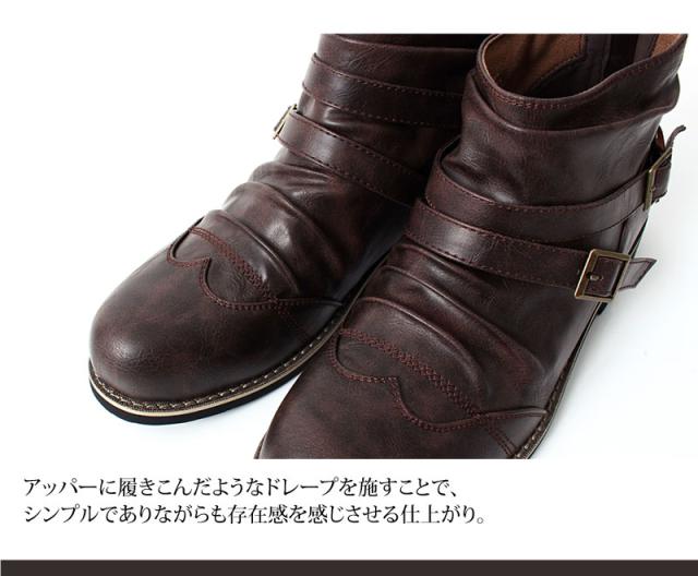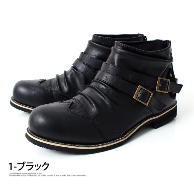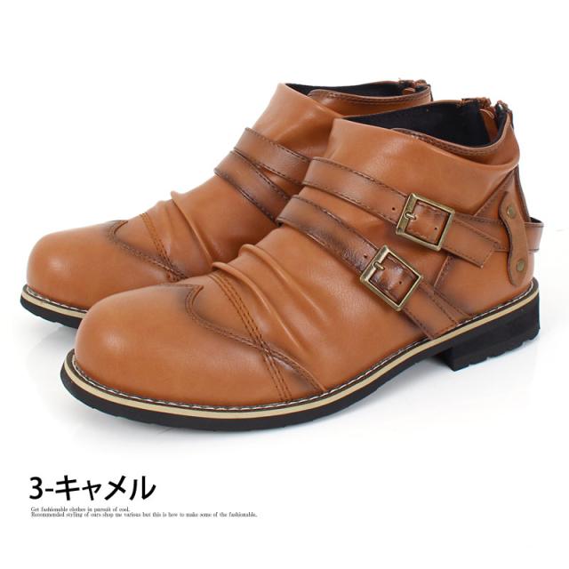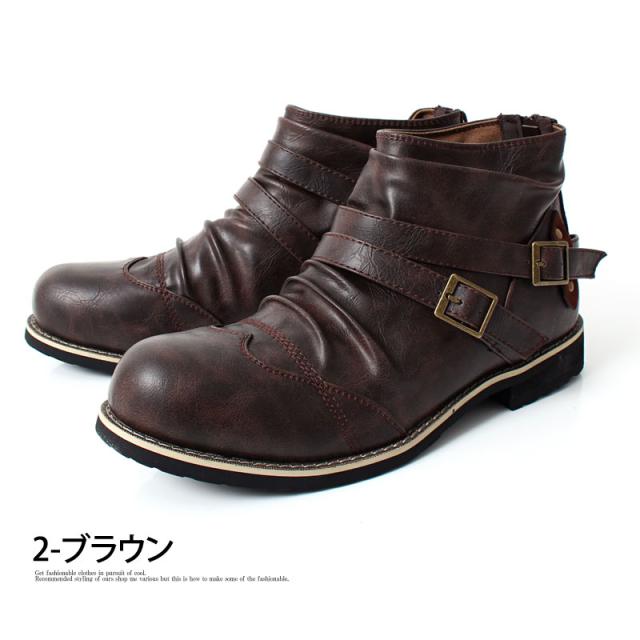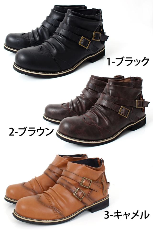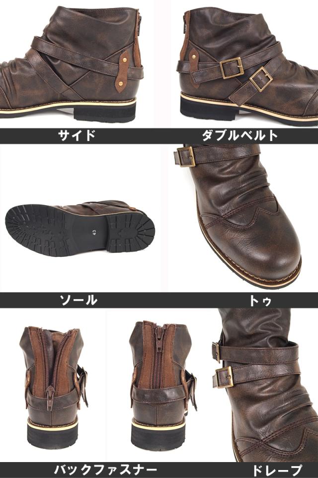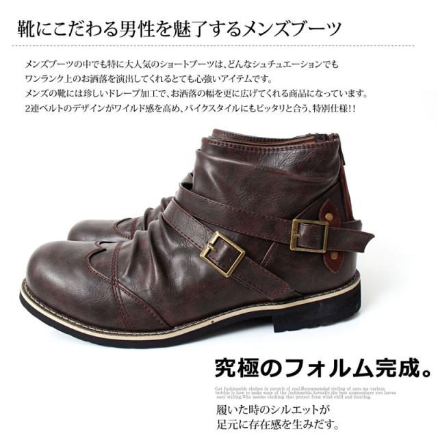 送料無料 ブーツ メンズ 2連ベルト ドレープ ショートブーツ アンティーク加工 エンジニアブーツ ローカットブーツ ミリタリー 黒 ブラック ブラウン キャメル 25 26.0 26.5 27.0 28.0 春新作