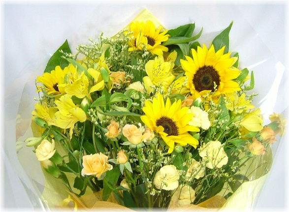 大人気のビタミンカラーの豪華なひまわりの入った花束です