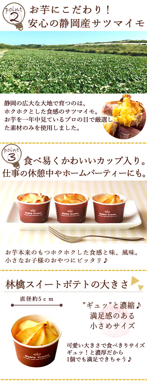 お芋の自然な甘みとりんごの酸味が見事に融合♪可愛いカップに入っているので仕事や休憩時間やホームパーティーにオススメ☆国産のお芋を使用しているので小さなお子様のおやつにもピッタリ♪直径5cmと小ぶりですが1個で十分満足して頂ける大きさです!