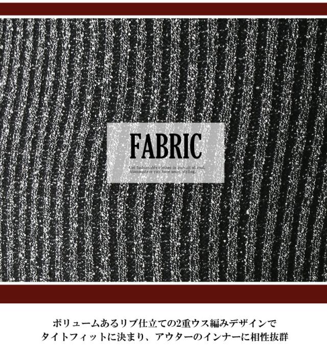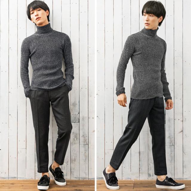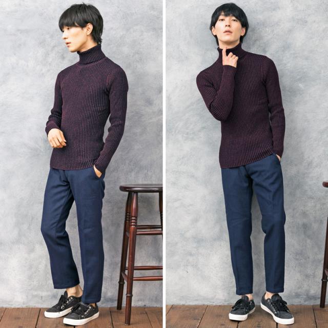 ボリュームあるリブ仕立ての2重ウス編みデザインでタイトフィットに決まり、アウターのインナーに相性抜群のタートルニットセーターです!
