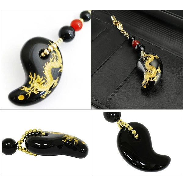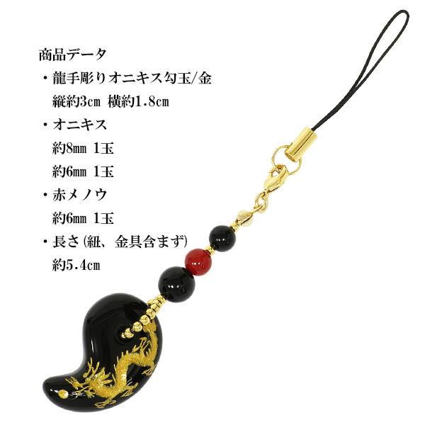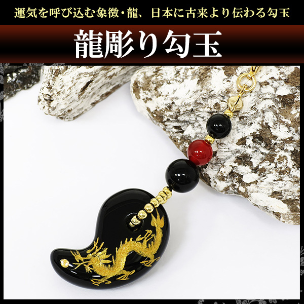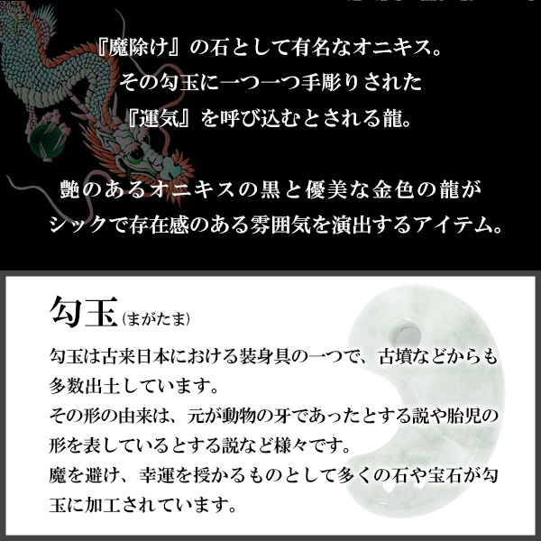 日本に古来より伝わる勾玉と運気を呼び込む象徴・龍、魔除けの石として有名なオニキス。縁起の良いものをふんだんに取り入れた、とても迫力のあるストラップです!