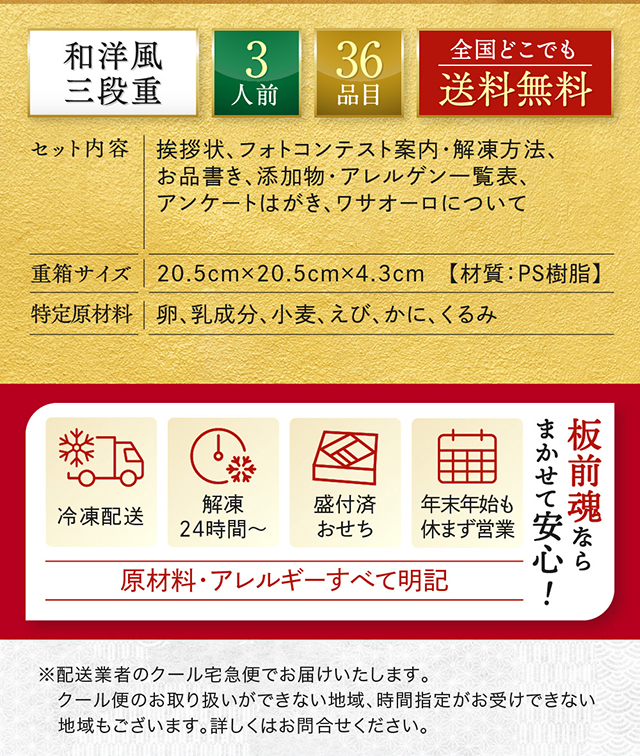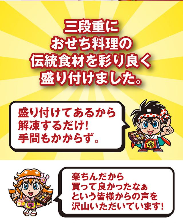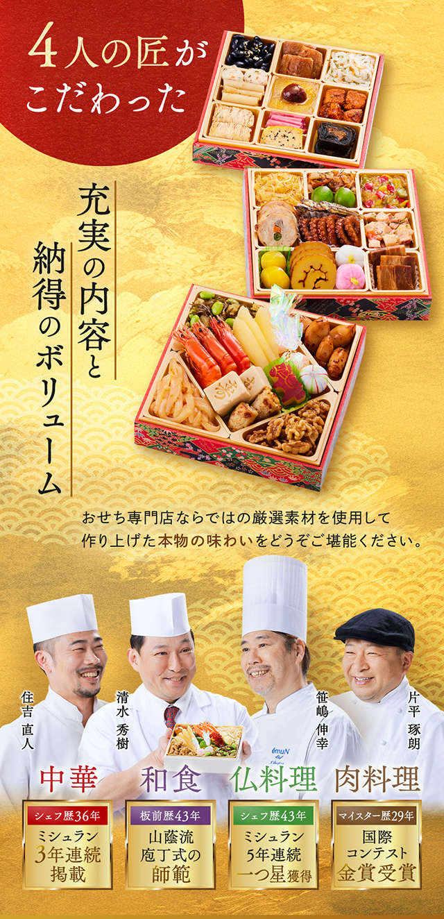 板前魂のおせち料理は、函館、小樽 、仙台、 築地 、山梨、金沢、浜松、 京都 、下関、 博多 、鹿児島など日本や海外の産地をまわり厳選した食材を使用し、有名店やホテルで修行したシェフや繁盛店を営む板長といった4人の匠が監修しています。