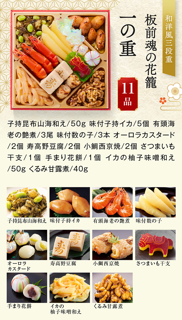 【一の重】子持昆布山海和え/味付子持イカ/有頭海老の艶煮/味付数の子/オーロラカスタード/寿高野豆腐/小鯛西京焼/さつまいも干支/手まり花餅/イカの柚子味噌和え/くるみ甘露煮