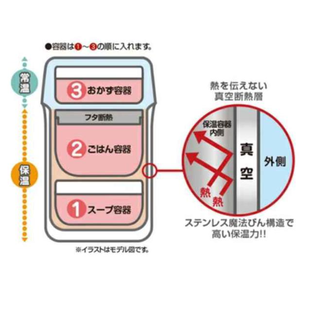 ごはんとスープは真空断熱層で温かく保温、いたみやすいおかずは常温でキープします。作りたての温かさとおいしさをそのまま持ち運べます。