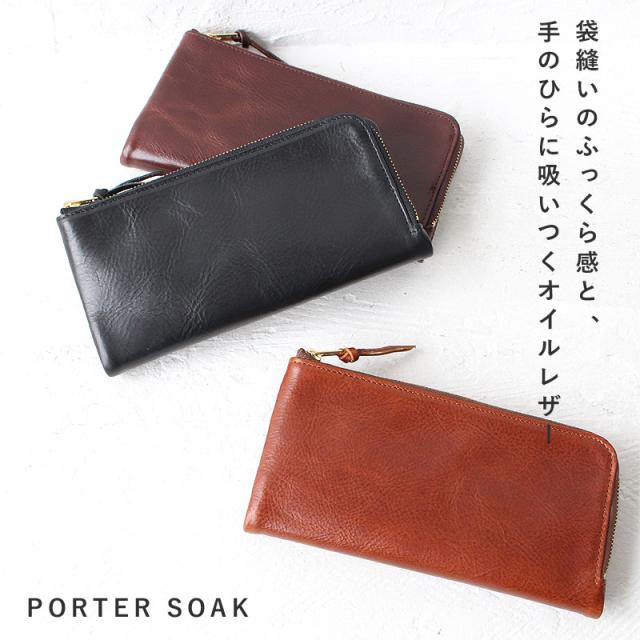 ポーター ソーク PORTER SOAK コーナーのふっくら感がソフトな雰囲気を醸し出しているシリーズ《SOAK》 表革にはイタリアの輸入牛革を使用し、裏地には摩擦に強い豚革を使用! このデザインは袋上に縫製し、ひっくり返すことで生まれるふっくら感を活かし、素朴で優しいテイストに仕上げています。 表革は軽いキズがついても指や布でこすることで目立ちにくくなるのが特徴で、金物付属はツヤを抑えたアンティークゴールドを採用しており、全体のアクセントとなっています! SOAK一覧はこちら>>