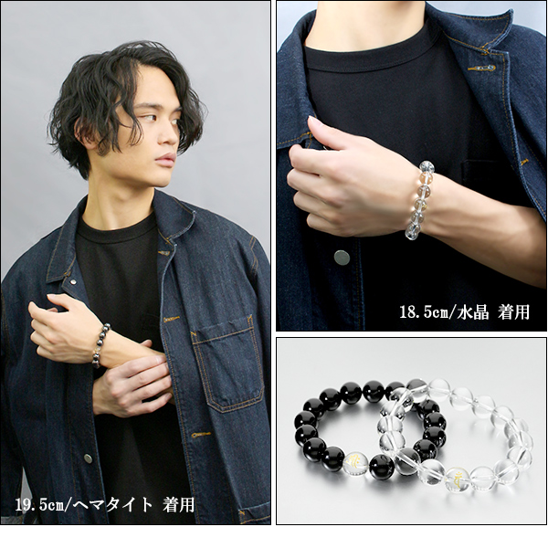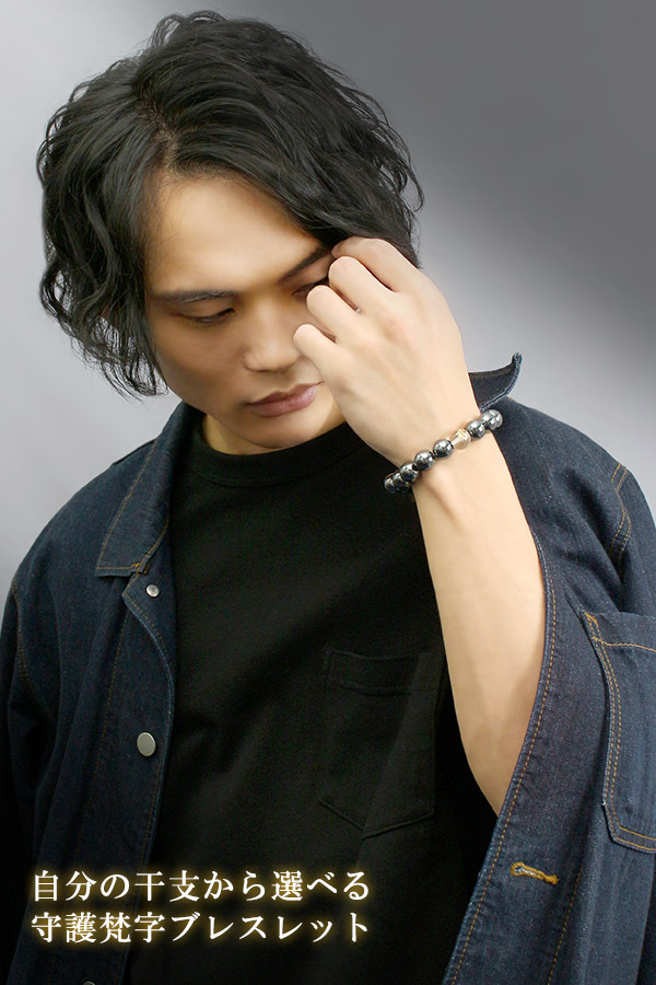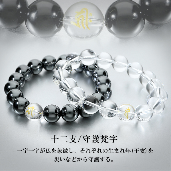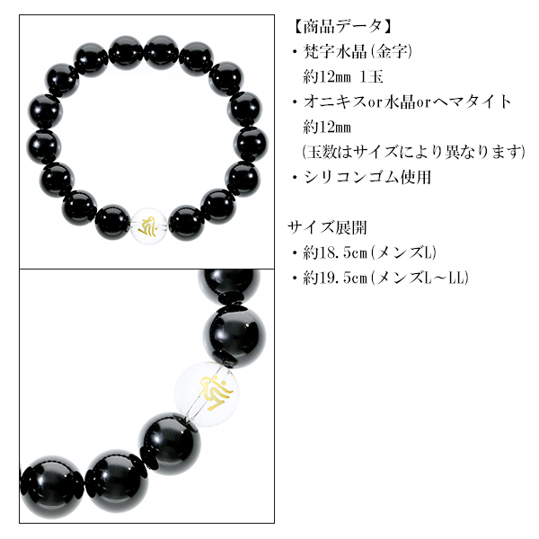 梵字 十二支 守護 ブレスレット 水晶 ヘマタイト オニキス 12mm 18.5〜19.5cm M〜LL サイズ