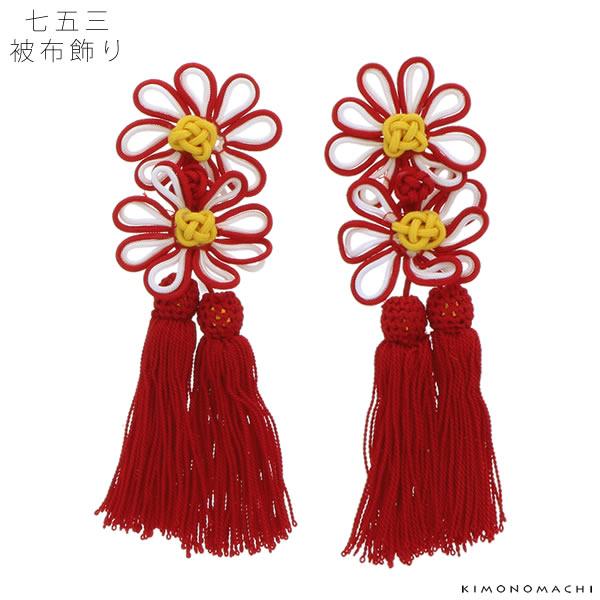 七五三の三歳の女の子が羽織る被布コートの両胸につける飾りです。紅白の紐で作られたお花モチーフに赤色の房がとりつけられた古典的な定番の被布飾りです。