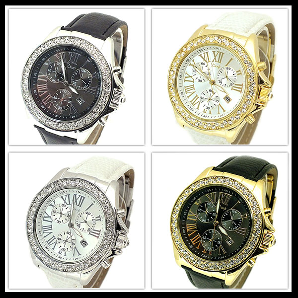 時計 腕時計 レディース メンズ rhinestone Dummy Chrono Leather Band Watch ラインストーン ダミークロノレザー 送料無料 全4色