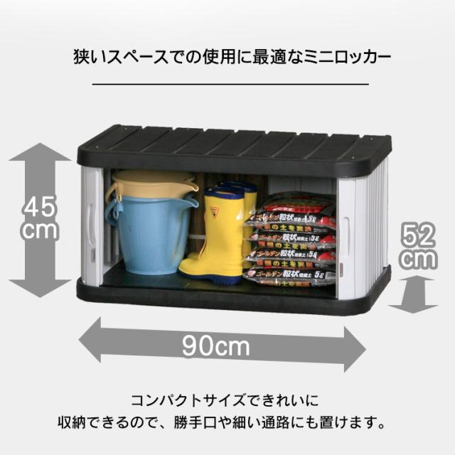 ベランダ等の狭いスペースでの使用に最適なミニロッカーです。園芸用品、レジャー・スポーツ用品の収納に便利です。扉は観音開きのシャッターで、しなやかでスムーズな開閉を実現。盗難防止に市販の南京錠が使える金具付です。★お客様組立て
