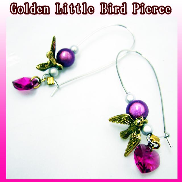 ピアスハピネスゴールドバード&ハートピアス金の小鳥と恋するピンクアミュレットハートアンティークロングピアス