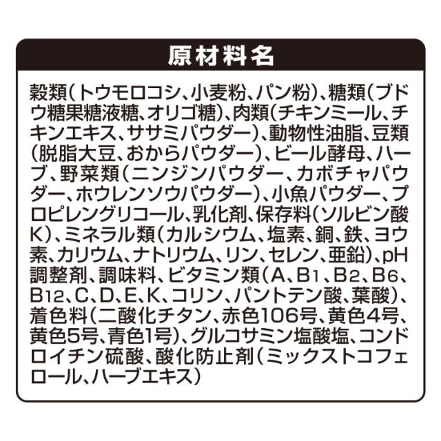 | 穀類(トウモロコシ、小麦粉、パン粉)、糖類(ブドウ糖果糖液糖、オリゴ糖)、肉類(チキンミール、チキンエキス、ササミパウダー)、動物性油脂、豆類(脱脂大豆、おからパウダー)、ビール酵母、ハーブ、野菜類(ニンジンパウダー、カボチャパウダー、ホウレンソウパウダー)、小魚パウダー、プロピレングリコール、乳化剤、保存料(ソルビン酸K)、ミネラル類(カルシウム、塩素、銅、鉄、ヨウ素、カリウム、ナトリウム、リン、セレン、亜鉛)、pH調整剤、調味料、ビタミン類(A、B1、B2、B6、B12、C、D、E、K、コリン、パントテン酸、葉酸)、着色料(二酸化チタン、赤色106号、黄色4号、黄色5号、青色1号)、グルコサミン塩酸塩、コンドロイチン硫酸、酸化防止剤(ミックストコフェロール、ハーブエキス) |