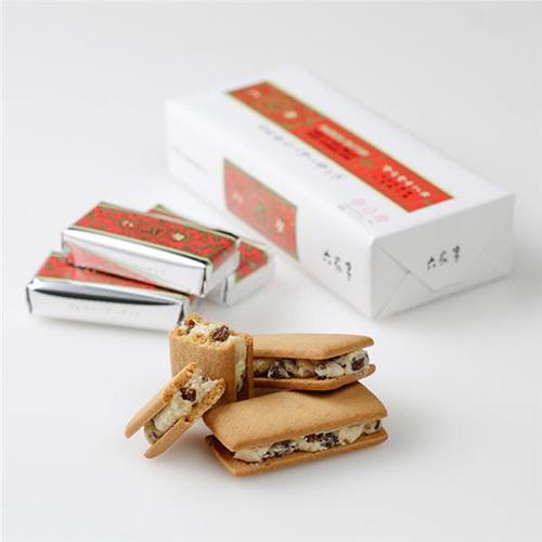 ホワイトチョコレートと北海道産生乳100%のバター、そしてカリフォルニア産のレーズンをあわせたクリームをサンドした、ロングセラー商品です。