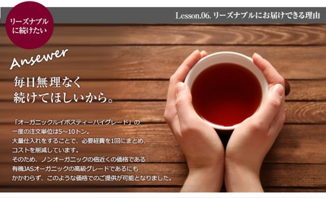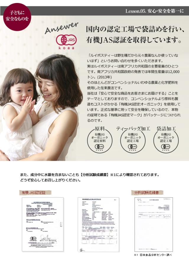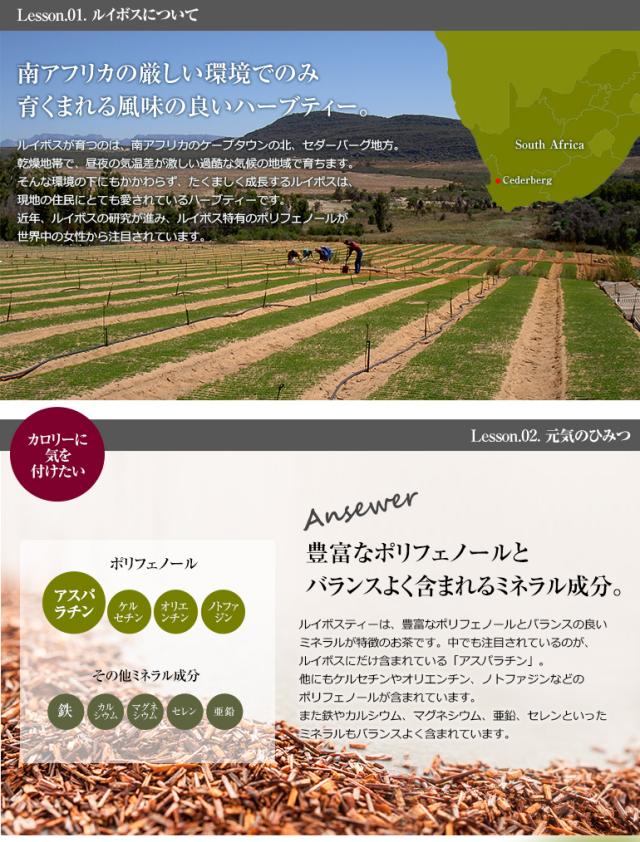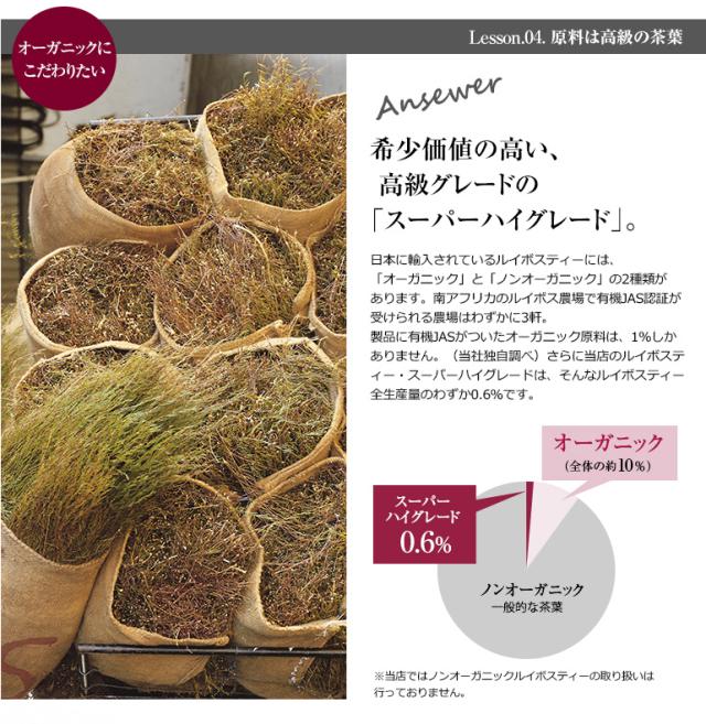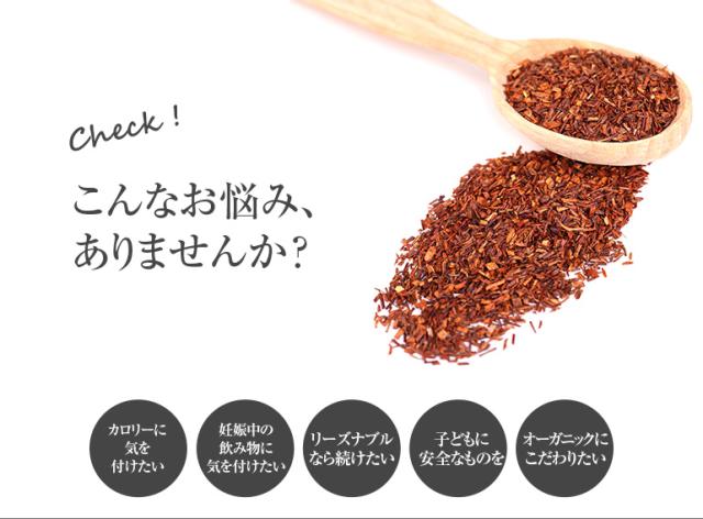 【特徴】最高品質のオーガニック・ルイボスティー茶葉は完全オーガニックなので安心・安全♪ 女性や子どもに嬉しいノンカフェイン・低タンニン。もちろん、フラボノイドもたっぷり。自然な甘みとすっきりした味わいの世界的に人気のあるお茶です。
