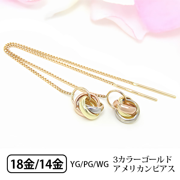 イエロー,ピンク,ホワイトの3カラーゴールドリングを交差させた、さらりと揺れるアメリカンピアス! 3カラーリングは幸運を呼ぶといわれるリングで、PG[恋愛・良縁]YG[金運・仕事運]WG[美しさ・健康]を表すとされています。動く度に3カラーのリングがキラキラと輝いて、さりげない個性が光ります! 軽やかに、そして華やかに揺らして、ラッキーを呼び寄せて☆