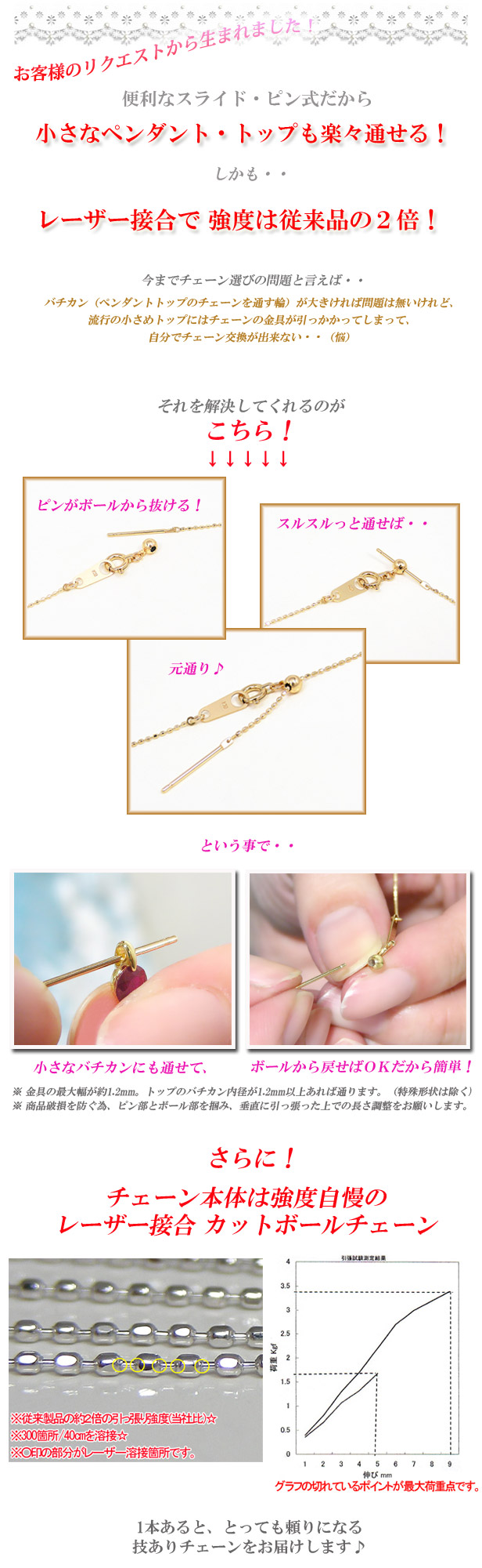 ペンダントトップが小さくて、チェーンの金具が引っかかり通らない(悩)そんな心配はもう不要です! 金具をピン状に加工したから、小さなバチカン(内径1.2mm以上)に対応♪ しかも負荷がかかるつなぎ目を強力に接合したカットボールチェーン!(強度は従来品の2倍)使い勝手も良く更に安心♪これは頼れるチェーンです!