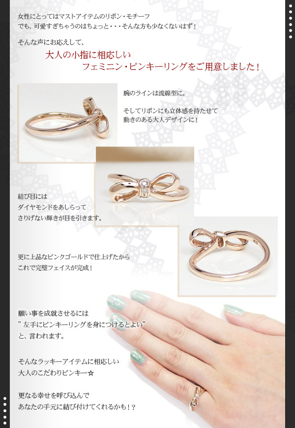 マストアイテムのリボン・モチーフ。でも、可愛過ぎちゃうのはちょっと・・そんな声にお応えして、大人の小指に相応しいフェミニン・ピンキーをご用意しました!腕のラインは流線型に。リボンは立体感を持たせて、動きのある大人デザインに!上品なピンクゴールド枠とダイヤを使って仕上げたから、これで完璧フェイスが完成!