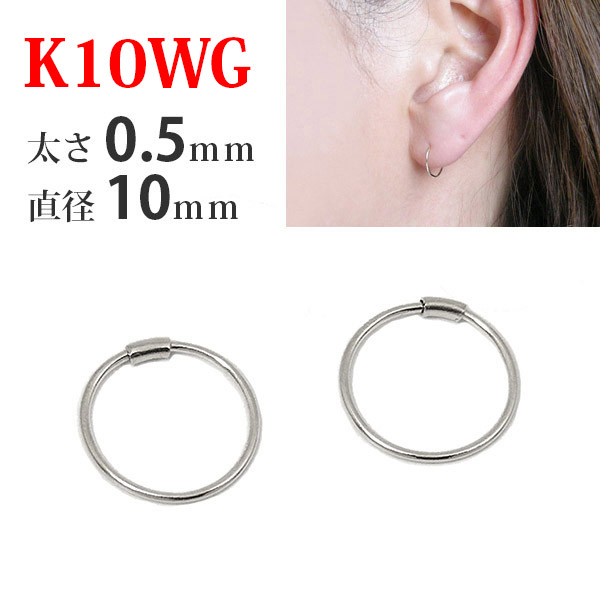 【両耳販売】 K10WG 10金 10k ホワイト ゴールド パイプ フープ ピアス 太さ0.5mm×直径10mm シームレス 差し込み レディース メンズ 輪っか リング キャッチレス