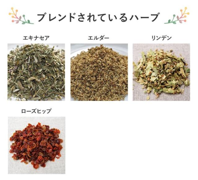 エキナセア(ドイツ)、エルダーフラワー(ウクライナ)、ローズヒップ(チリ)、リンデン(ルーマニア)