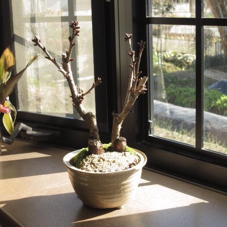 旭山桜が2本植わった、華やかな桜盆栽です。
