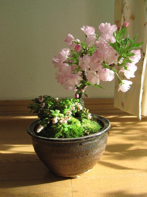 八重桜盆栽とコケモモの寄せ植え盆栽 苔モモ 桜盆栽(茶)