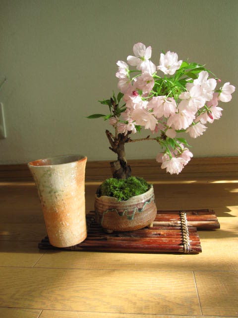 信楽鉢入りの八重桜ミニ盆栽と信楽炎彩コップのセットです。