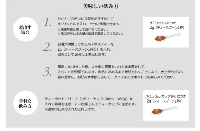 【おすすめの飲み方】ポットに3g程度のリーフをいれ、2〜400ccのお湯を注ぎ、3〜5分蒸らしてお召し上がり下さい。(蒸らし時間が長い方が濃く出ます)お湯の量はお好みに応じて調整してください。