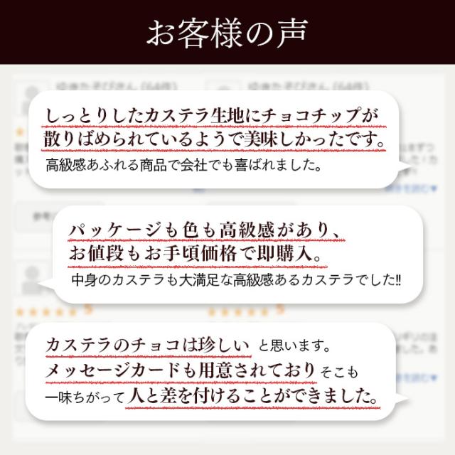 - カステラとチョコレートが好きな友人に送りました。 凄く喜んでもらえました。ありがとうございます。