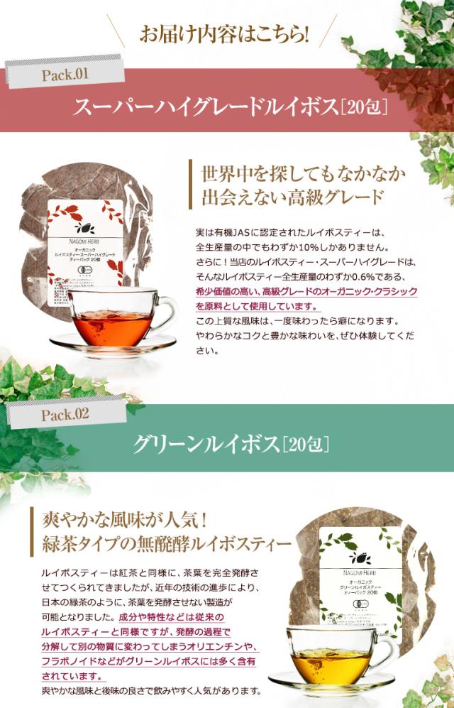 【内容量】オーガニック・ルイボスティー スーパーハイグレード TB20包、オーガニック・グリーンルイボスティー TB20包、ジンジャールイボスチャイ10包、ローゼズブレンド10包