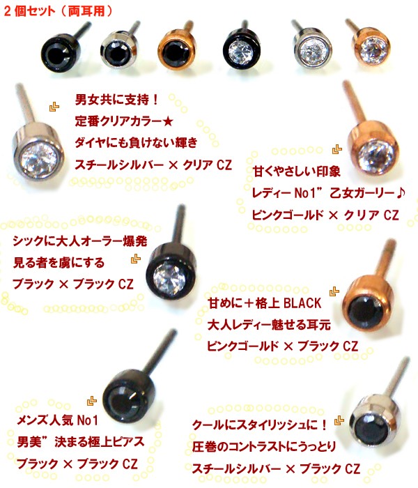 | コメント | ※両耳用になります。 きっと全色欲しくなる一粒ジルコニアスタッドピアス。一番輝きを放つといわれる1粒デザインは男女ともに人気のアイテムです。6色の中からひとつだけお選びください。 |