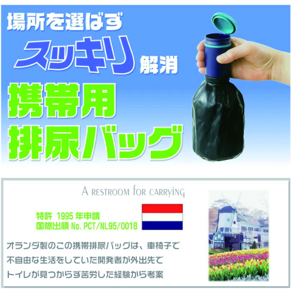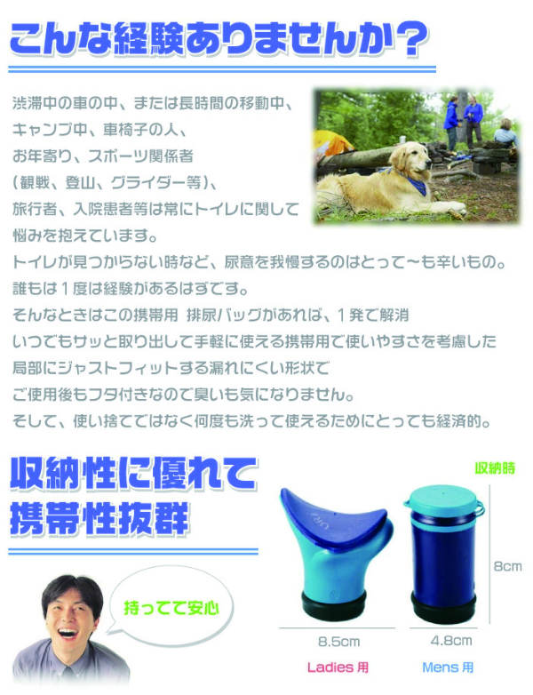 渋滞中の車の中、または長時間の移動中、キャンプ中、車椅子の人、お年寄り、スポーツ関係者、旅行者、入院患者等は常にトイレに関して悩みを抱えています。トイレが見つからない時など、尿意を我慢するのはとっても辛いもの。そんなときはこの携帯用 排尿バッグがあれば、1発で解消!いつでもサッと取り出して手軽に使える携帯用で使いやすさを考慮した、局部にジャストフィットする漏れにくい形状で、ご使用後もフタ付きなので臭いも気になりません。そして、使い捨てではなく何度も洗って使えるためにとっても経済的。