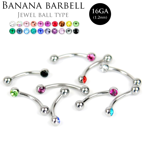 【メール便対応】特殊 片側ジュエルボール バナナバーベル 16G(1.2mm) カラー ボールサイズ3mm ラインストーン付 ボディピアス ボディーピアス アイブロウ 眉ピ ┃