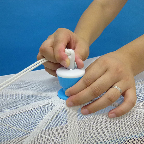 蚊帳上部のつまみ部分のロックを押し込み、紐を引っ張るように折りたたみます。