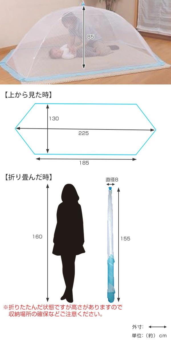 夏のイヤな虫や、虫除けの薬品、エアコンの直風から守ります。手洗いOKでいつでも清潔に使えるので、お子様との添い寝やペット用にも最適です。折りたためてレジャーにも持ち運びやすいです。