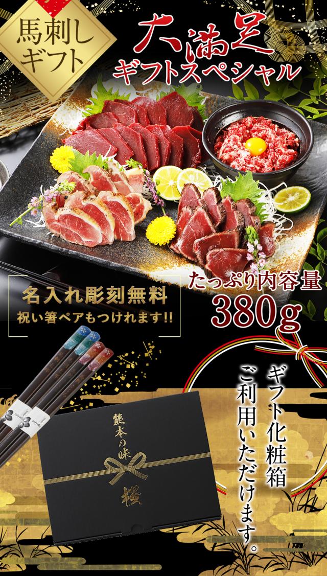 馬刺し 馬肉 熊本 ギフトスペシャルセット 380g 名入れ 有料祝い箸ペア ※北海道、沖縄、離島は別途追加送料 馬刺 ばさし 国産 贈答 贈り物 プレゼント 純馬刺し 産直 国内肥育 通販 人気 名産 お歳暮