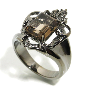 中央にスモーキークォーツを留めた盾を、王冠と植物のツルが飾り付けるようにデザインされたシルバーリングです。ブラックロジウムの色合いとスモーキークォーツの輝きによる、シックな輝きと気品のあるデザインが見事に合わさった一品。