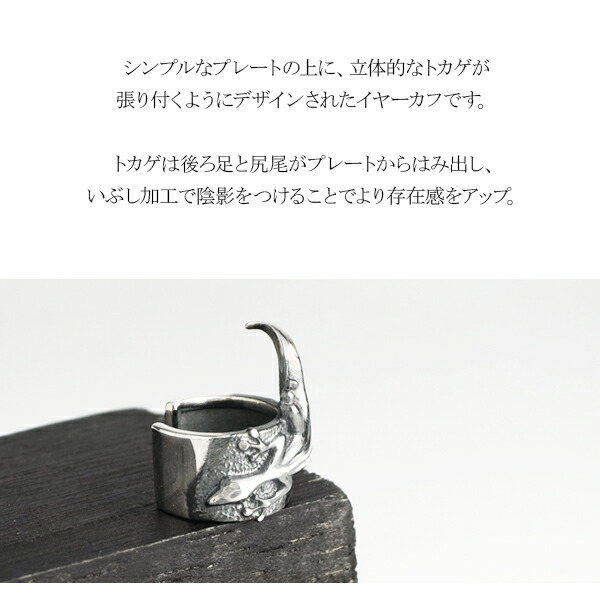 シンプルなプレートの上に、立体的なトカゲが張り付くようにデザインされたイヤーカフです。