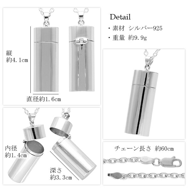 円柱型 筒型 シルバー ピルケース ネックレス チェーン付ペンダント シルバー925 メンズ レディース ペンダント 薬入れ 薬ケース くすりケース