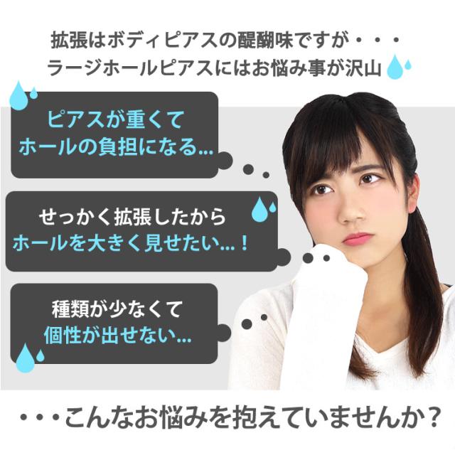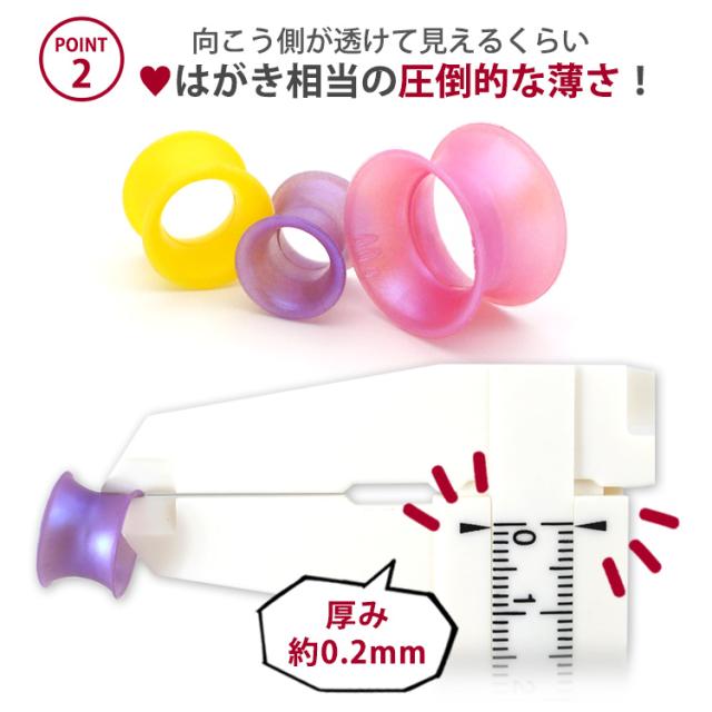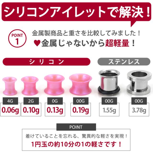 軽さと柔軟性で究極の快適さを実現したアイレットが誕生しました。折りたたんでホール中で膨らませるようにして装着できます。とても薄くて軽いので大きなホールなのに何もつけていないような快適さを実現しています。カラーは人気のクリアやブラックのほか鮮やかなパール系のポップなカラーも取り揃えております。太さのサイズも4G、2G、0G、00Gと豊富なので、一段階ずつの拡張にも最適です。ピアスの材質は金属アレルギーの方でも安心なサージカル素材のシリコンを使用しております。