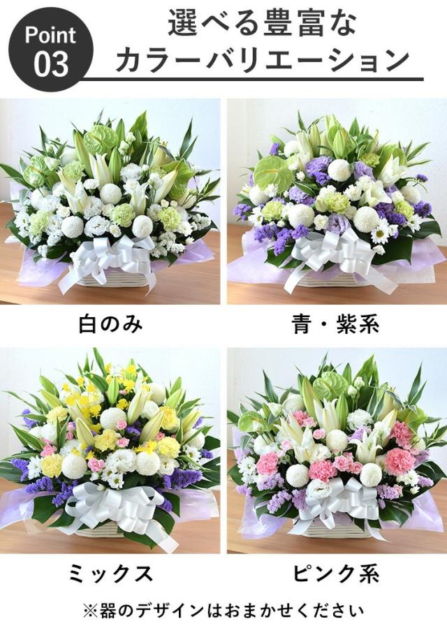 ●白のみ、にはグリーン系のお花が入ることがあります。 ●白+ブルーパープル、には、季節や入荷状況により、ブルー、またはパープルの花については、いずれかのお色になる場合があります。