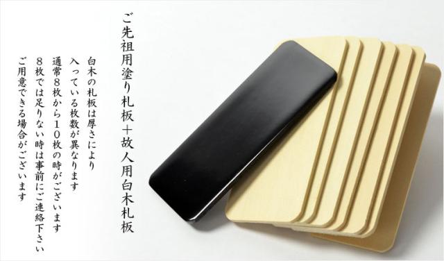 黒塗りの一枚は、一般的に○○家先祖代々之霊位を入れる、彫り/書き対応可能、白木板は書きのみの対応になります。