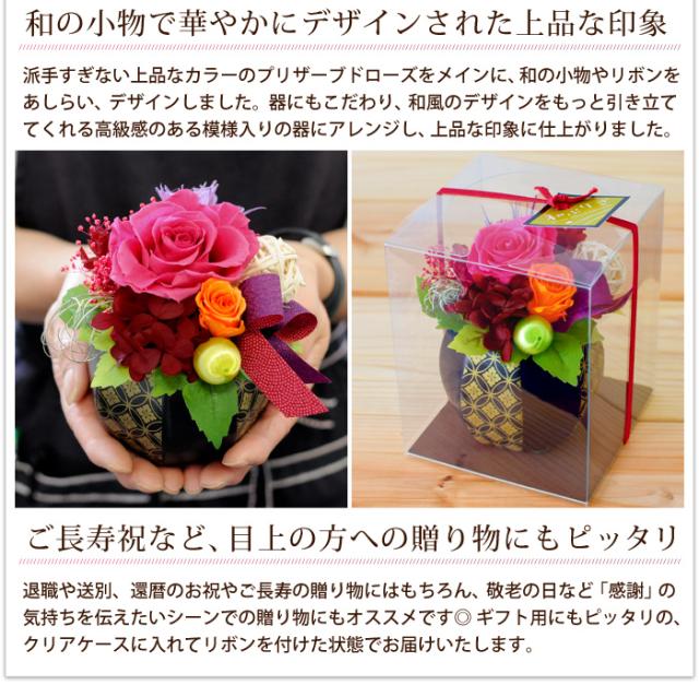 - プリザードフラワーは初めててしたが、秋限定の麻の葉模様の入れ物が可愛らしく、色合いも柔らかい印象で、妻も喜んでくれました。