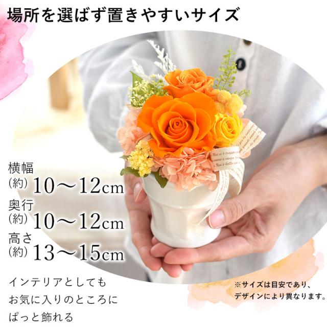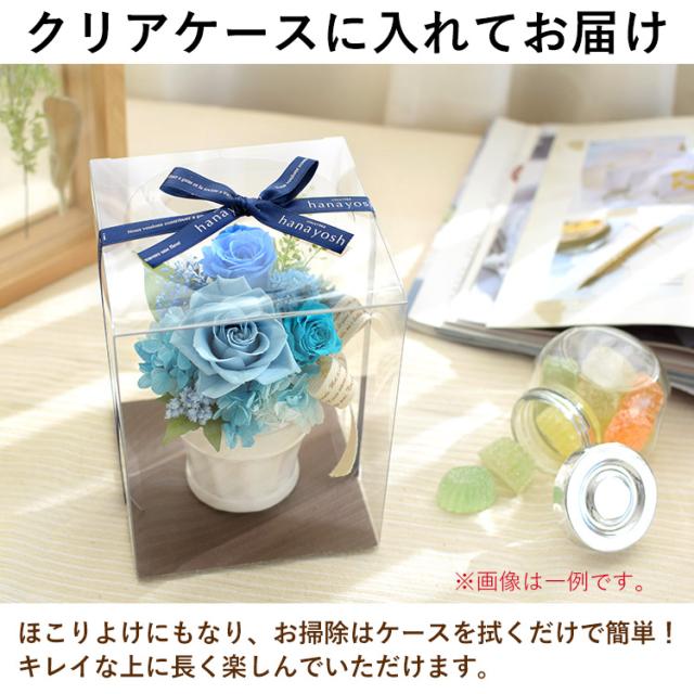 | サイズ | アレンジのサイズ:(約)横10〜12×奥行き10〜12×高さ13〜15(cm) ※デザインにより異なります。 クリアケースのサイズ:(約)□12センチ×高さ16センチ |