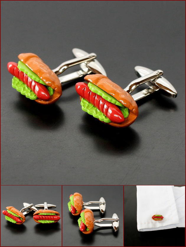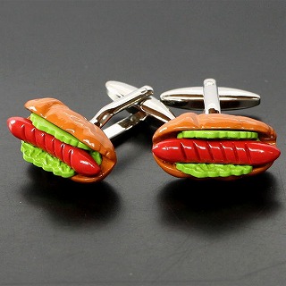 ホットドックをモチーフにしたユニークなカフスボタン。