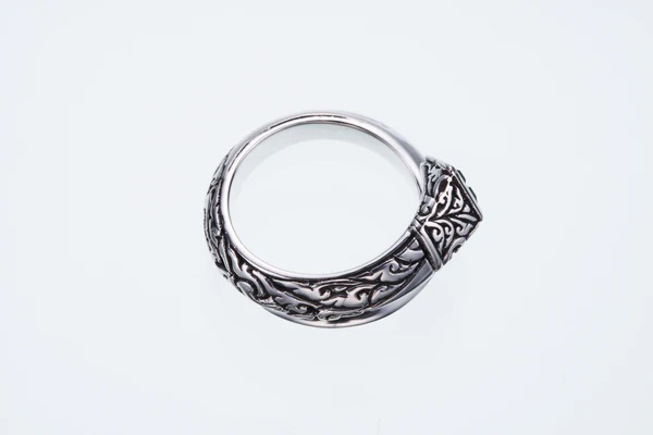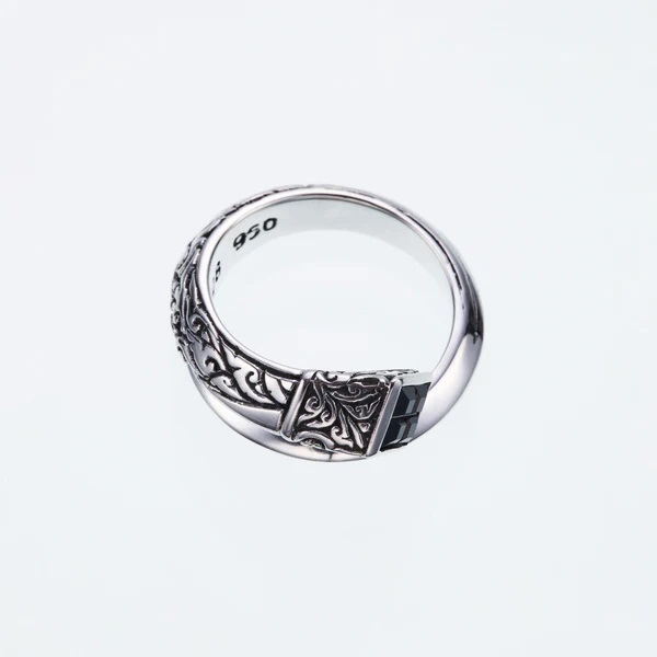らせん状の先端にアイビー模様が掘り込まれ、クールで大人な雰囲気のスクエアカットのブラックジルコニアを使用した美しいリング。