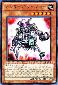 このカードが「スクラップ」と名のついたカードの効果によって破壊され墓地へ送られた場合、「スクラップ・ソルジャー」以外の自分の墓地に存在する「スクラップ」と名のついたモンスター1体を選択して手札に加える事ができる。