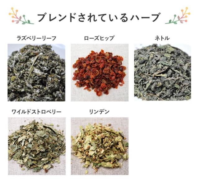 ラズベリーリーフ(アルバニア)、ローズヒップ(チリ)、ネトル(アルバニア)、ワイルドストロベリー(ブルガリア)、リンデン(ブルガリア)