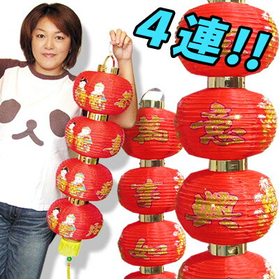 おめでたい招財童の絵柄の4連のランタン。別名四串提灯