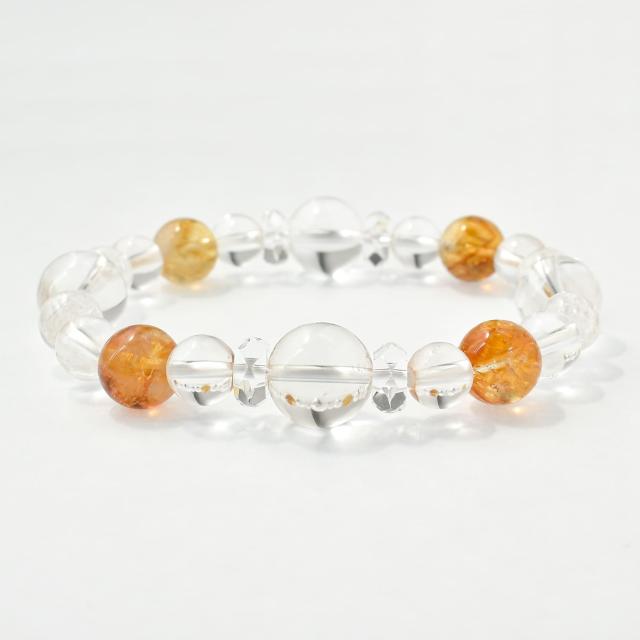 仕事の成功を呼び込むブレスレット自分の誕生石を身につけると、幸運を呼び込み身を守ってくれるといわれています。これは持ち主の特徴や人柄を引き出したり高めたりする、いわば持ち主を良い方向に導く力があるということです。シトリン( 10mm ) × 4水晶・クォーツ( 12mm ) × 4水晶・クォーツ( 4x8mm ) × 4水晶・クォーツ( 8mm ) × 8クラック水晶( 8mm ) × 4内径約 16.5cm
