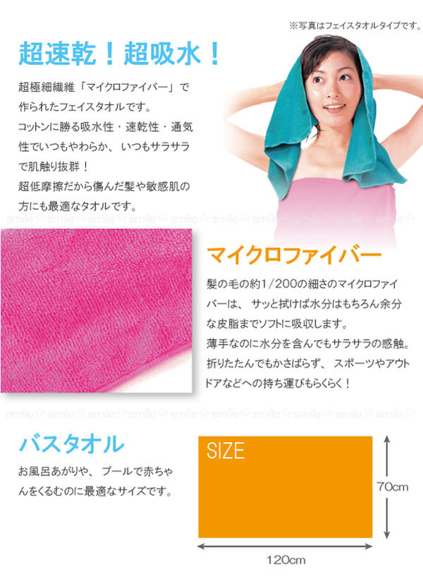 髪の毛の1/200の細さの超極細繊維「マイクロファイバー」を使用したバスタオルです。驚きの吸水力で濡れた髪もみるみる乾きます。サッと拭けば水分はもちろん皮脂までソフトに吸収してお肌や傷んだ髪の毛にも優しいタオルです。また、薄手なのに超吸収で超速乾だからいつもさらさらで肌触りも抜群です。お風呂上がりの拭き取りに、プールに、赤ちゃんをくるむ時に最適な大きめサイズです。